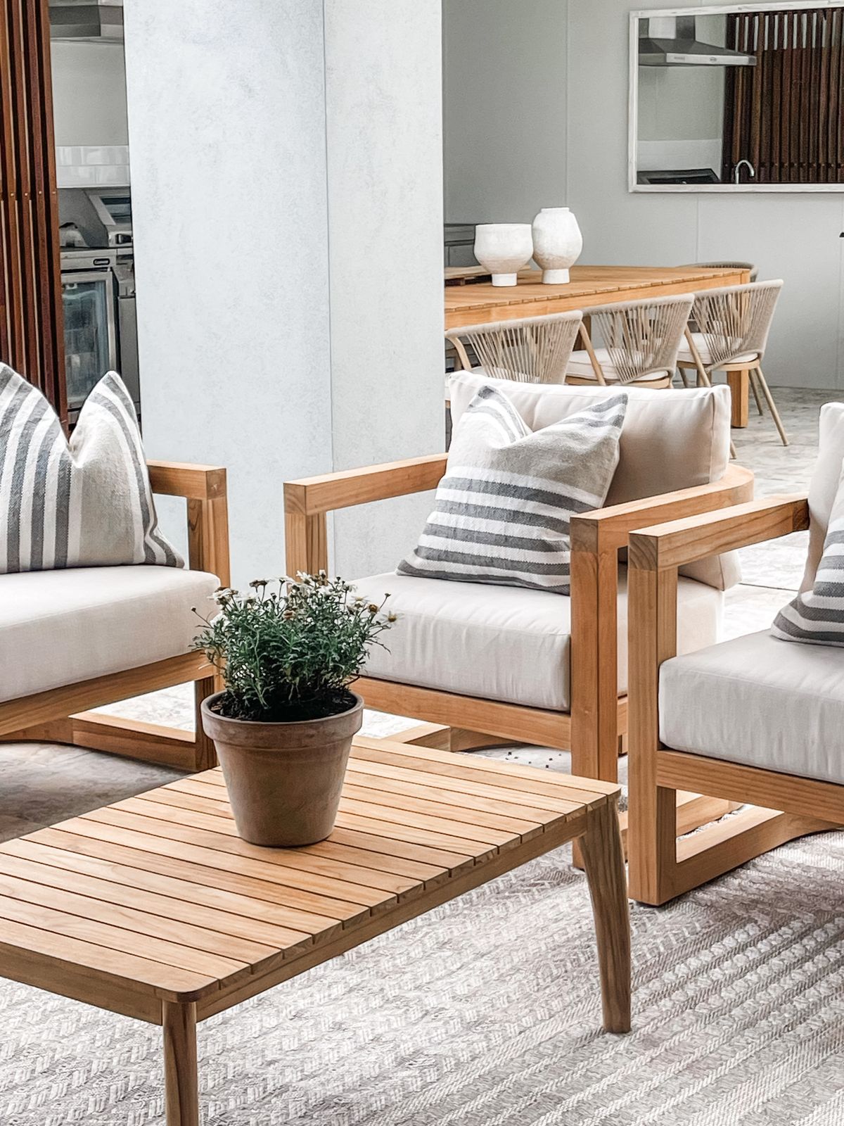 Add layers to the space to create a warm and inviting feel. Decorative cushions and an outdoor rug will do the trick, and remember to dot some beautiful potted plants around the area to add to the outdoor living room feel.