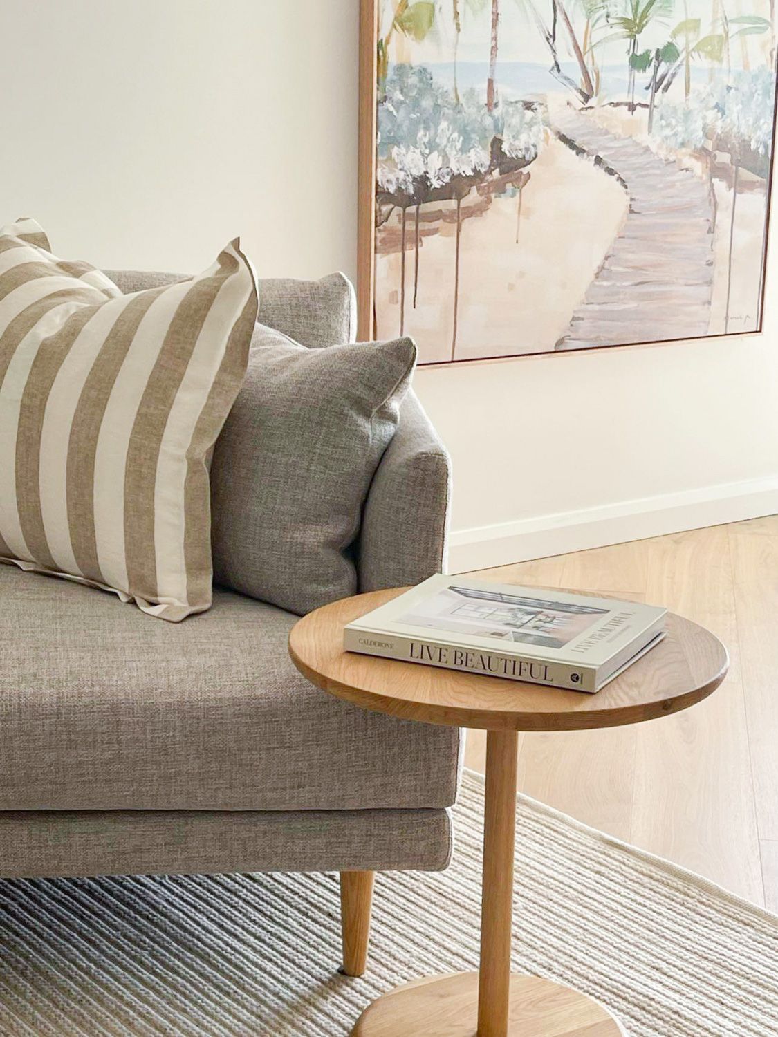 Instead of floating two armchairs and a side table together it's a good idea to group them by adding a rug. Depending on the shape of the space, a circular rug is a softer shape and allows for a little more flexibility. Just remember that the front legs of the chairs need to be on the rug!