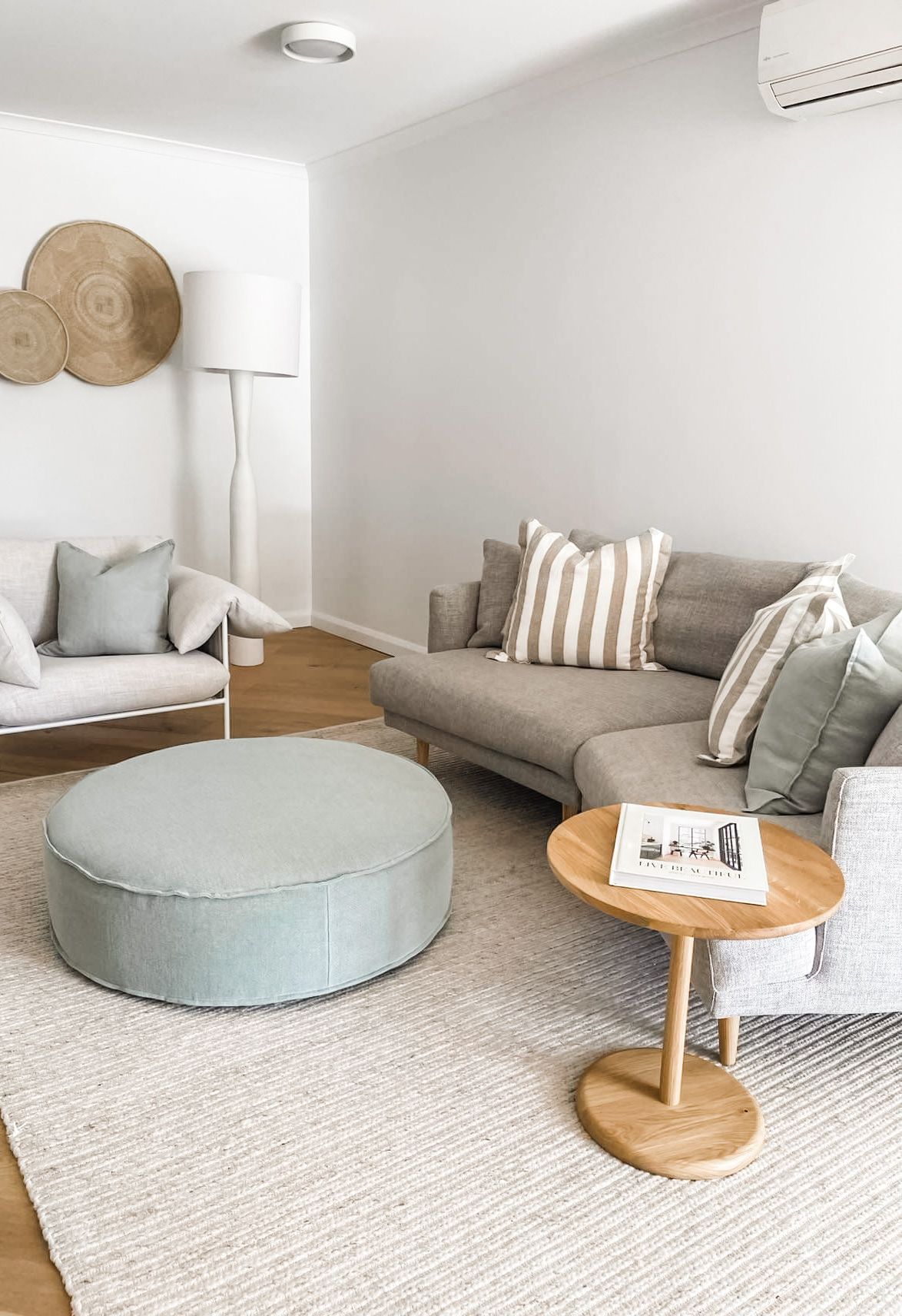 Our client wanted the bedrooms to mirror each other by using the same bedside tables and lamps, so the way we helped differentiate each room was by mixing up the decorative cushions and throws. We continued the muted palette seen in the living room through to the bedrooms for cohesion. Soft greens, blues and neutral tones were used to create tranquil spaces that embody the laid-back, relaxed vibe you get from a getaway to the beach. The beautiful light oak Globe West bedside tables reflected the timbers chosen in the main spaces, with the muted brass handle adding a subtle luxe touch.