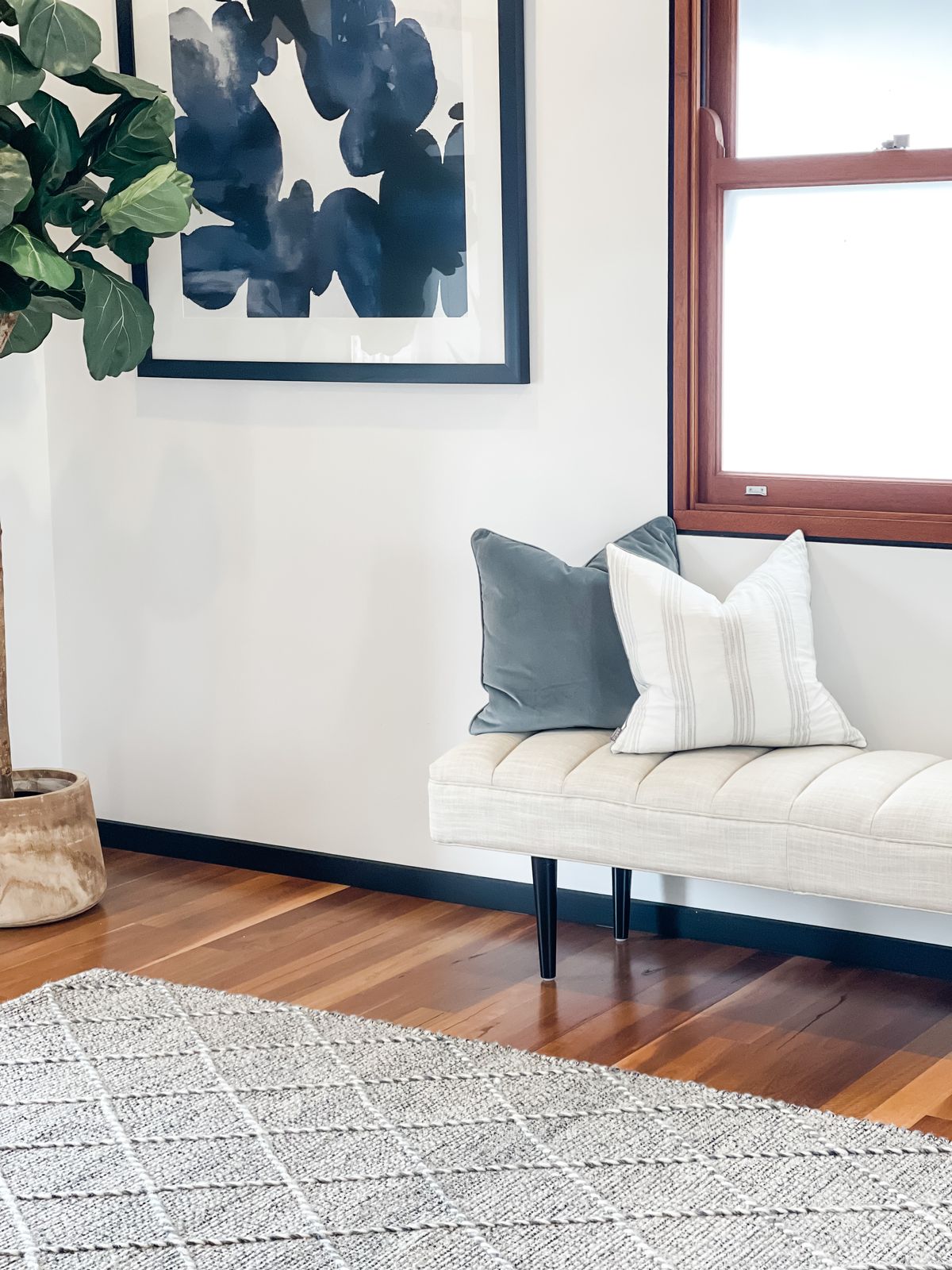 We selected some beautiful Eadie Lifestyle cushions that showcased muted blue tones to tie bridge a soft and calming feeling with the vibrant abstract artwork. The raised textured pattern in the wool rug provided visual interest without being too busy. Don't think the black legs of the ottoman was an afterthought - we purposely hand-selected this piece because the silhouette and black detail referenced the black frame of the artwork, skirting, and steel windows in the extension. It's these little considerations that add to the overall look.