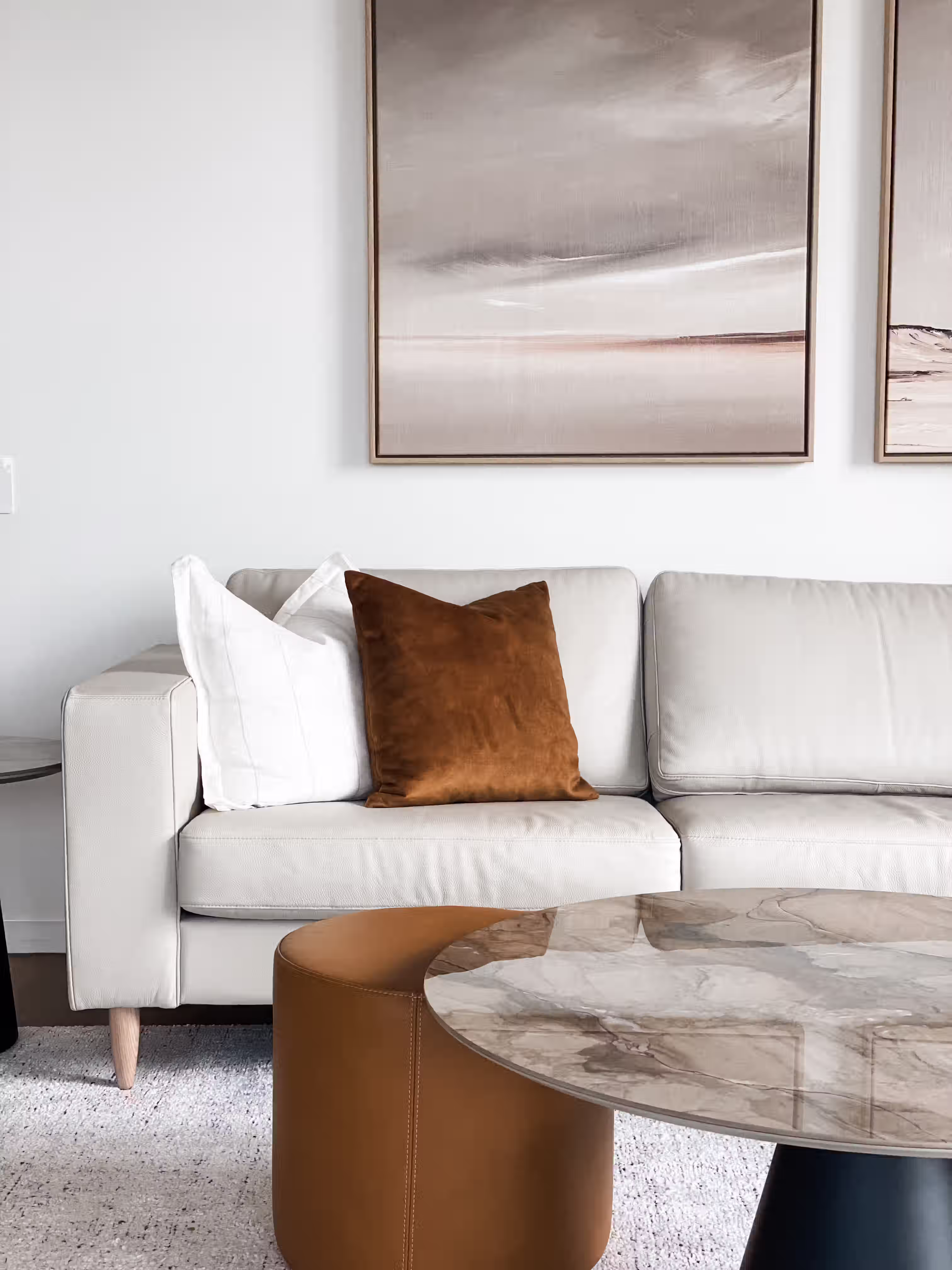 Apartment living for our client, who plans to host a lot of friends and family here, meant opting for furniture that focused on function, such as the beautiful swivel dining armchairs, extension dining table, the nesting ottoman and stunning ceramic coffee and side table.